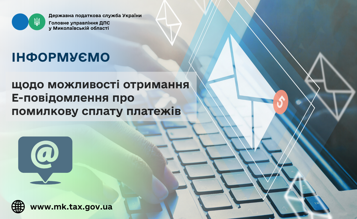 Головне управління ДПС у Миколаївській області повідомляє, що з метою підвищення рівня інформування платників податків про суми помилково сплачених податкових платежів, єдиного внеску в Електронному кабінеті платника (далі – Електронний кабінет) розроблено та впроваджено новий сервіс «Е-повідомлення».