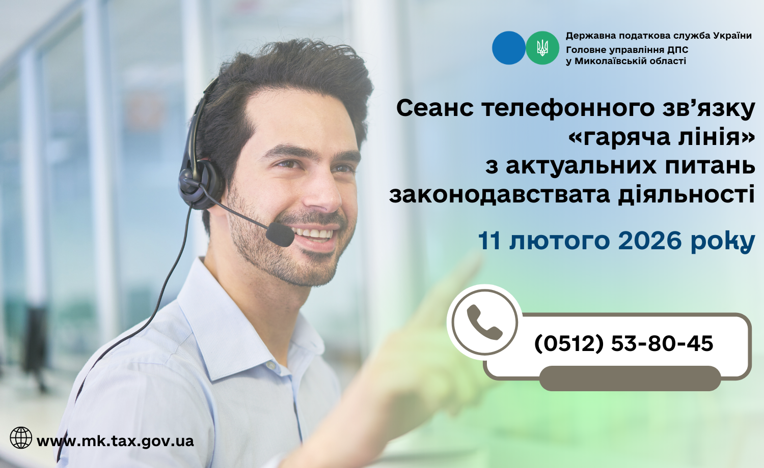 Головне управління ДПС у Миколаївській області проводить з 10 год. 00 хв. до 11 год. 00 хв. 11 лютого 2026 року сеанс телефонного зв’язку «гаряча лінія» з актуальних питань законодавства та діяльності