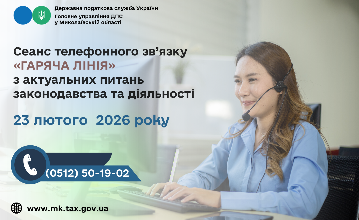Головне управління ДПС у Миколаївській області проводить з 10 год. 00 хв. до 11 год. 00 хв. 23 лютого 2026 року сеанс телефонного зв’язку «гаряча лінія» з актуальних питань законодавства та діяльності