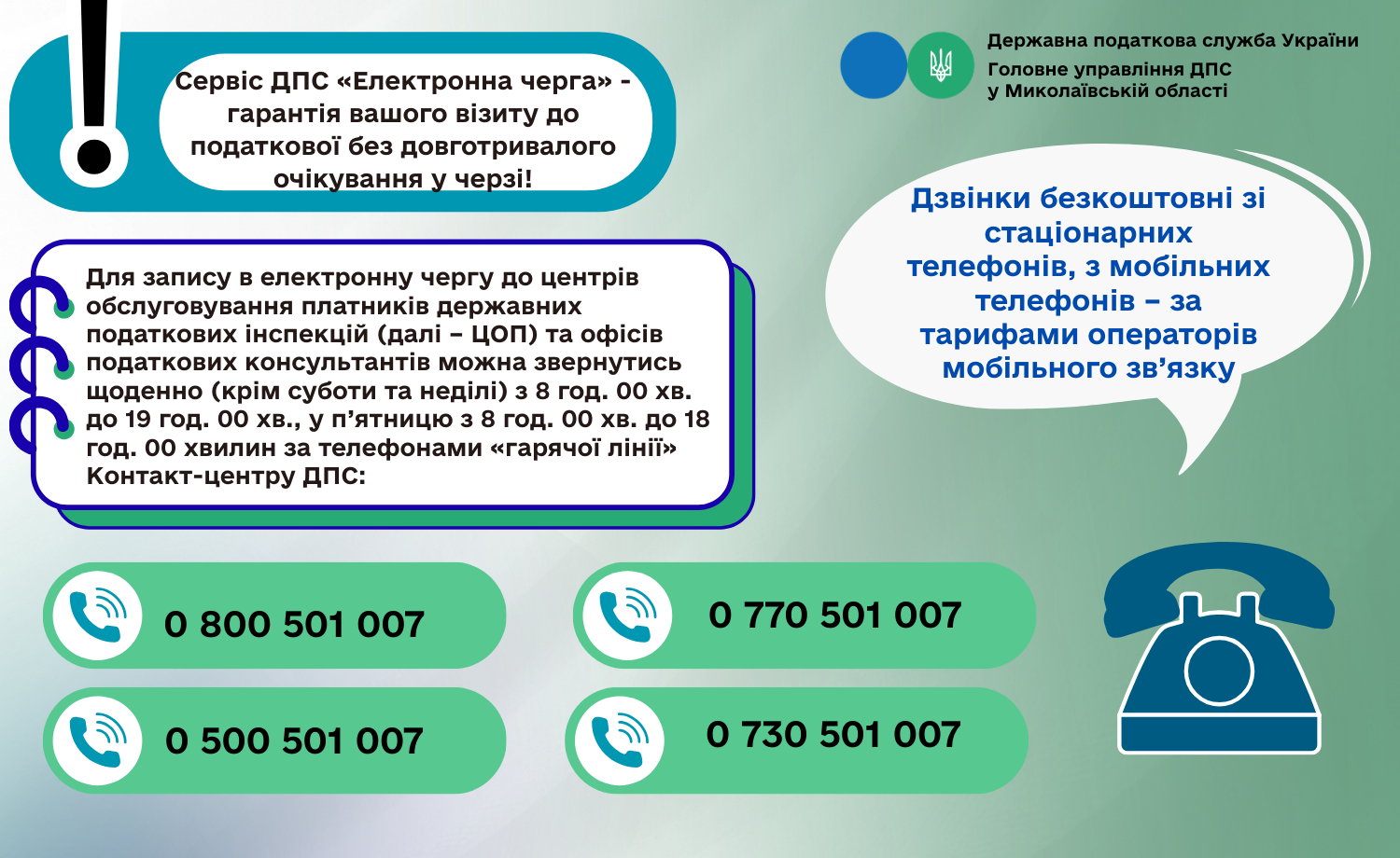Для запису в електронну чергу до центрів обслуговування платників державних податкових інспекцій (далі – ЦОП) та офісів податкових консультантів можна звернутись щоденно (крім суботи та неділі) з 8 год. 00 хв. до 19 год. 00 хв., у п’ятницю з 8 год. 00 хв. до 18 год. 00 хвилин за телефонами «гарячої лінії» Контакт-центру ДПС: