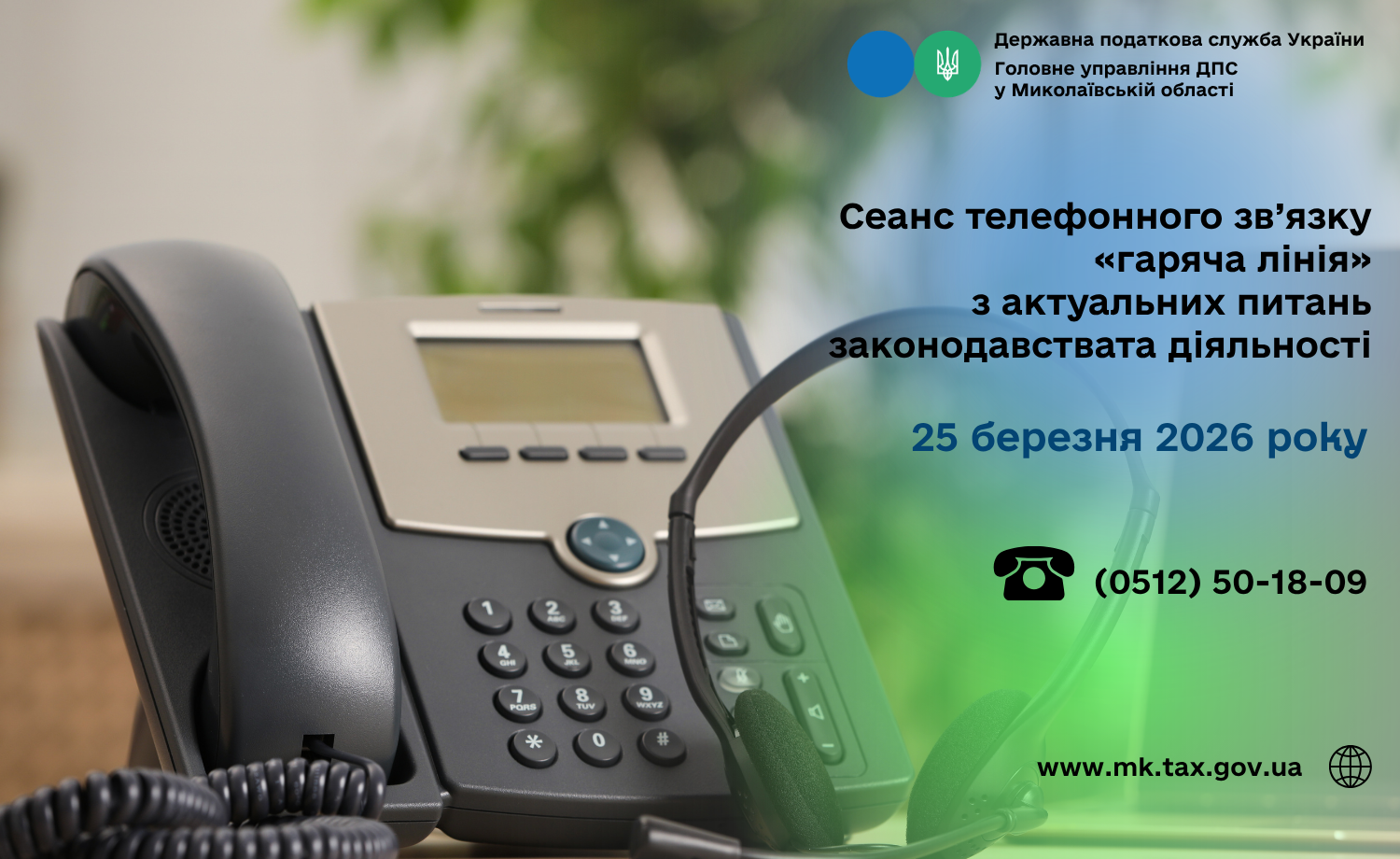 Головне управління ДПС у Миколаївській області проводить з 10 год. 00 хв. до 11 год. 00 хв. 25 березня 2026 року сеанс телефонного зв’язку «гаряча лінія» з актуальних питань законодавства та діяльності