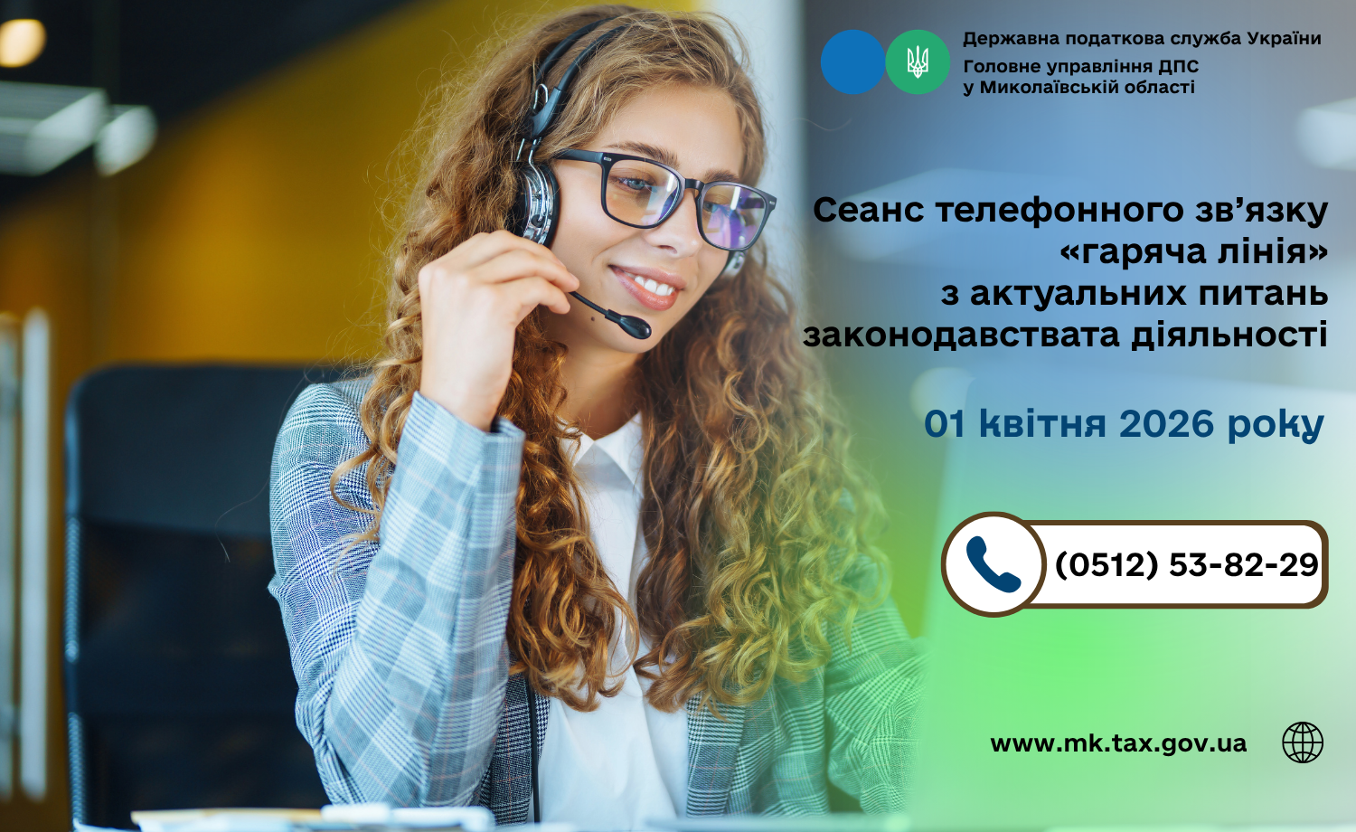 Головне управління ДПС у Миколаївській області проводить з 10 год. 00 хв. до 11 год. 00 хв. 01 квітня 2026 року сеанс телефонного зв’язку «гаряча лінія» з актуальних питань законодавства та діяльності