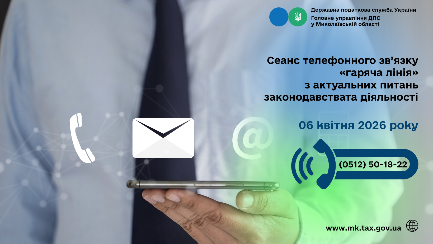 Головне управління ДПС у Миколаївській області проводить з 10 год. 00 хв. до 11 год. 00 хв. 06 квітня 2026 року сеанс телефонного зв’язку «гаряча лінія» з актуальних питань законодавства та діяльності