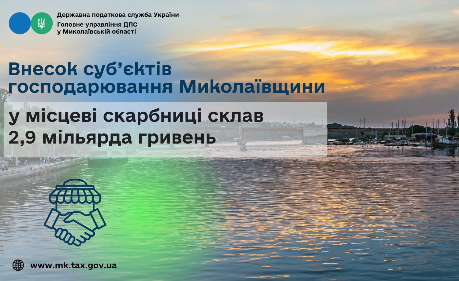 Головне управління ДПС у Миколаївській області повідомляє, що у січні – березні 2026 року до місцевих скарбниць сплачено 2,9 мільярда гривень податків, що перевищило минулорічні надходження за аналогічний період на 444,8 мільйона гривень.