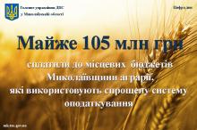 За 8 місяців 2019 року сільгосптоваровиробниками Миколаївщини, які використовують спрощену систему оподаткування IV групи, перераховано до місцевих бюджетів області 104,8 млн грн єдиного податку.