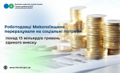 У січні - листопаді 2025 року платники податків Миколаївщини перерахували до пенсійного та соціальних фондів України майже 15,4 млрд грн єдиного внеску на загальнообов’язкове державне соціальне страхування (далі – єдиний внесок), що на 19,3 відс., або на 2,5 млрд грн більше, ніж у аналогічному періоді 2024 року.