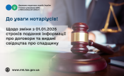 До уваги нотаріусів! Щодо зміни строків подання інформації про договори та видані свідоцтва про спадщину з 01.01.2026